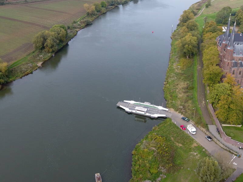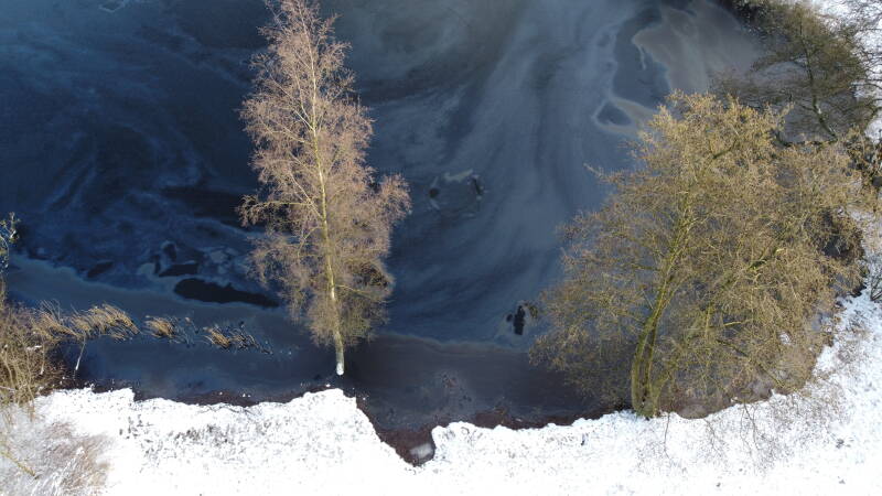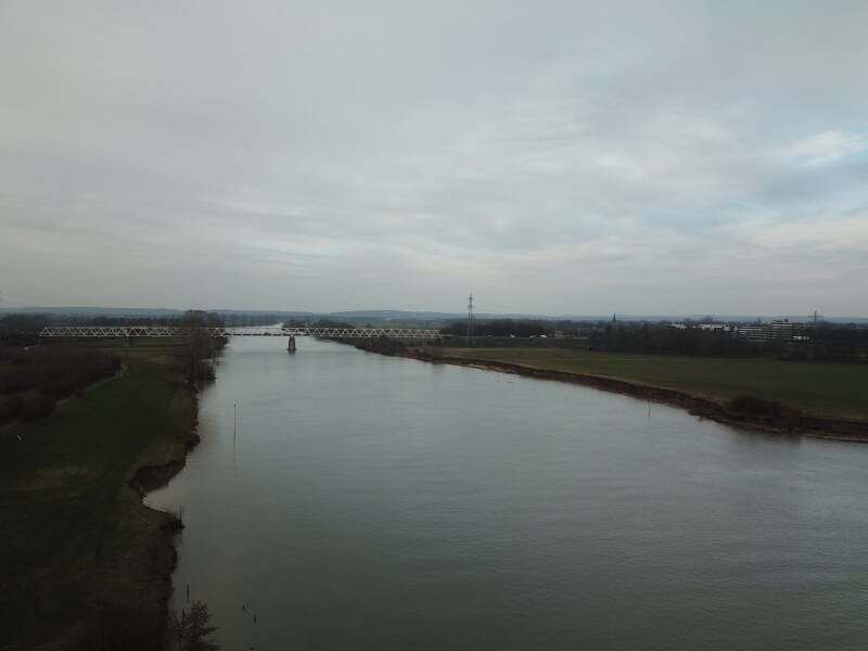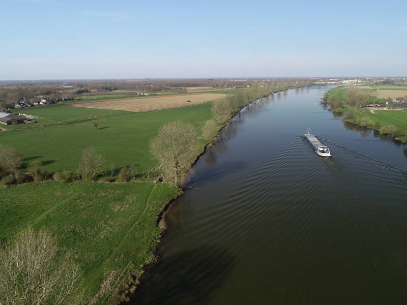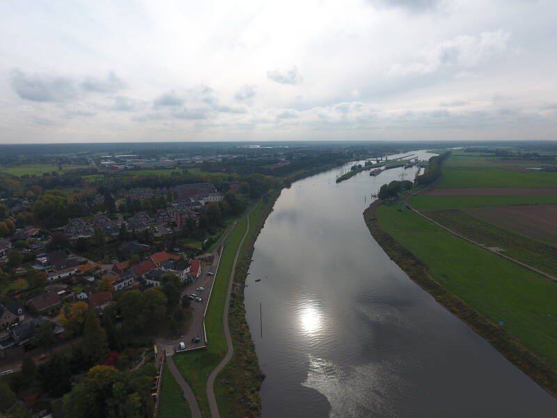 Boven: De DJI Phantom 4 Pro gezien door de camera van de DJI-Mavic. Locatie Maas bij Oeffelt (NB) en Gennep (LB)
